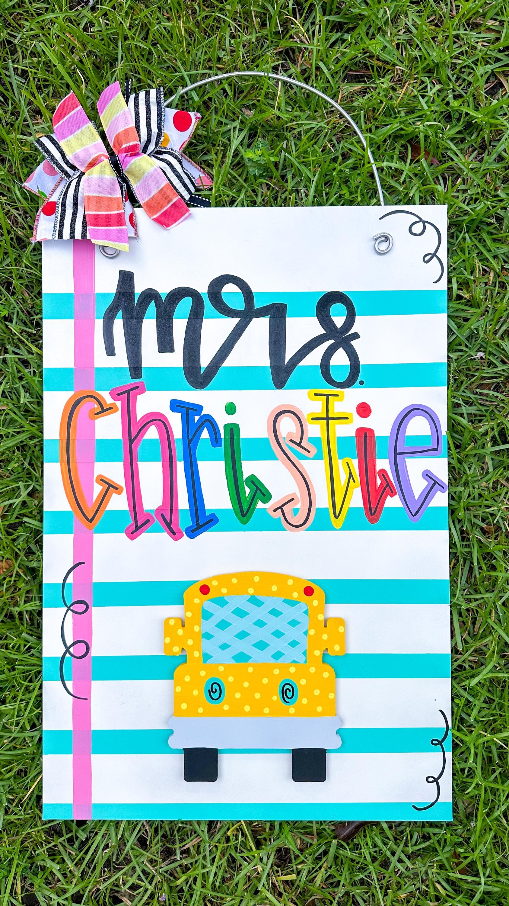 Looking for the perfect door hanger for your classroom or office that you can leave up no matter the season or theme?? Our attachment notebook door hanger is personalized with your name and comes with an attachment. Rectangle measures 24" and includes a wire hanger and bow. Custom attachments to match your school/classroom theme are available, but may add time to your shipment date. Please include your attachment choice below. If you would like a different attachment than what is offered below, please include that in the personalization area.