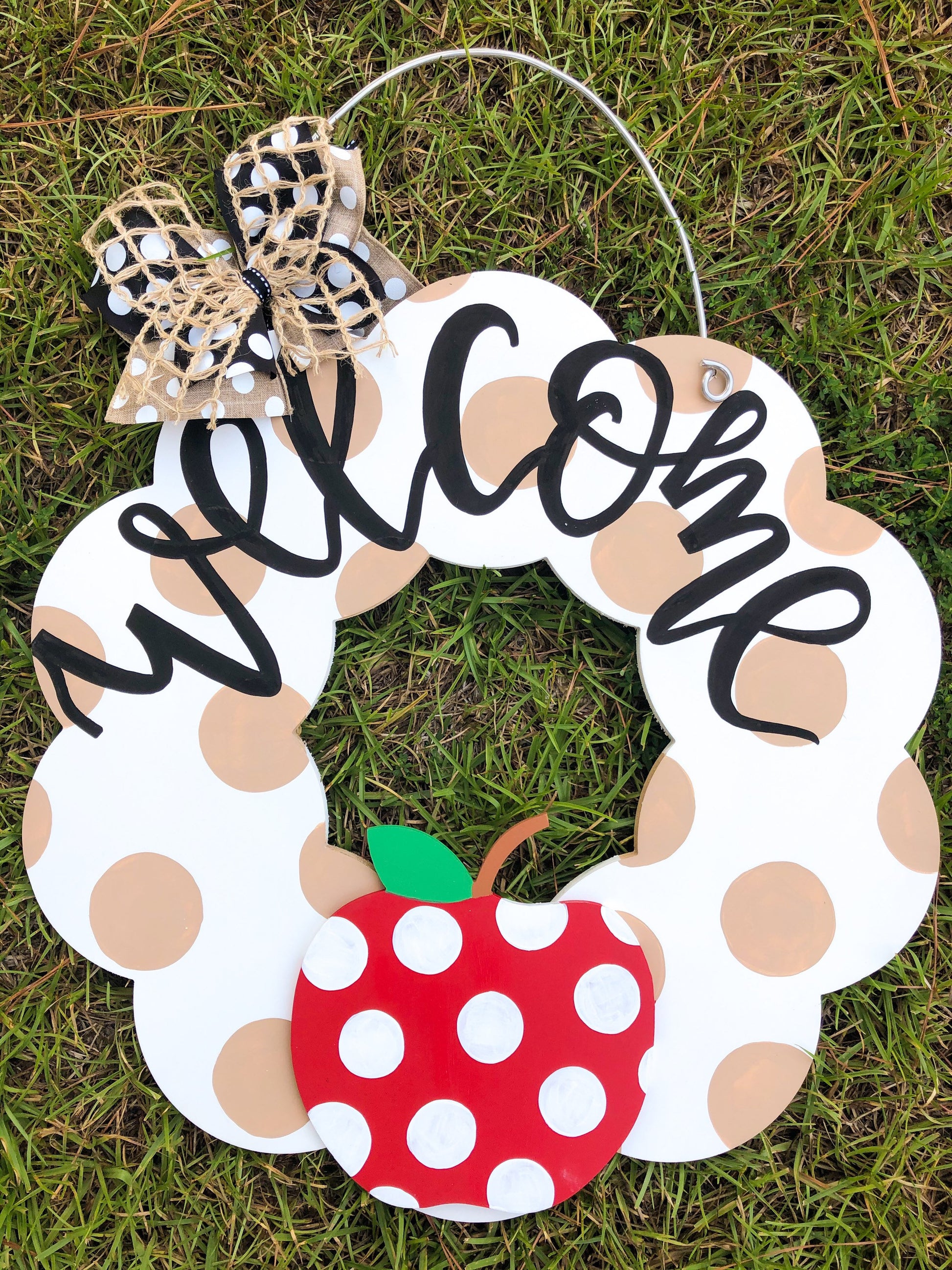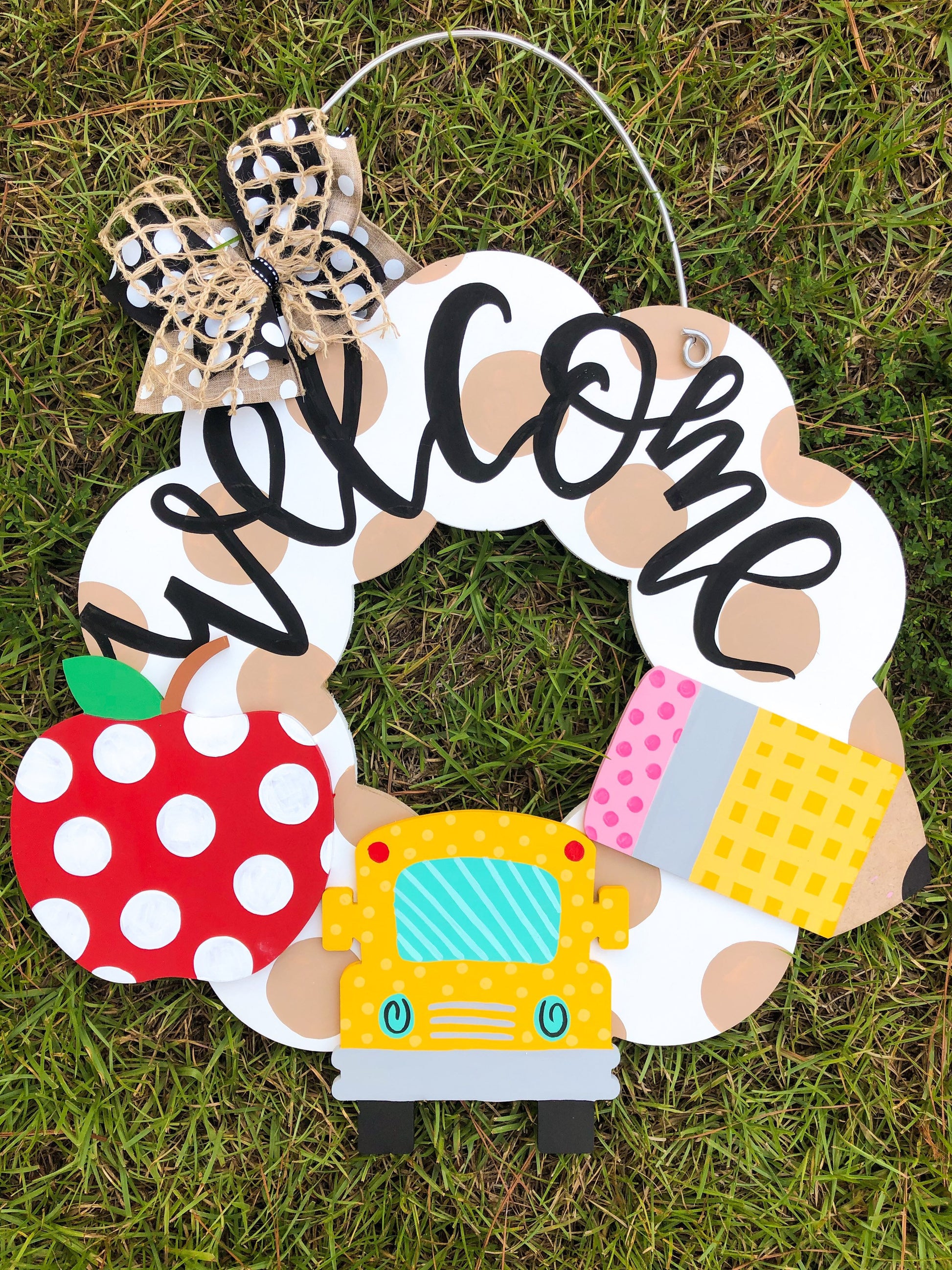 Celebrate back to school with our newest attachments! Choose from an apple, a bus, or a pencil. Each attachment comes with a Velcro backing to attach to our wreath (sold separately).