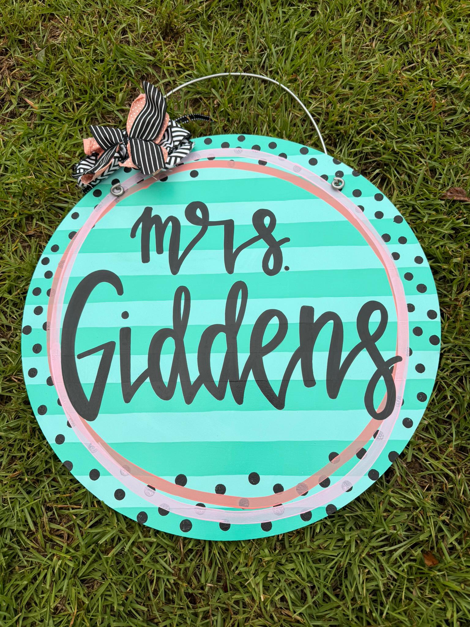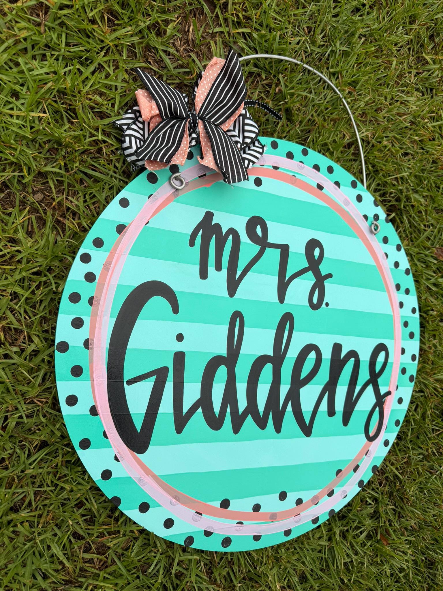 Circle measures 20" and includes a wire hanger and coordinating bow. Ribbon for bow depends on stock. Each door hanger is hand painted and may vary slightly from picture. Lettering will be in cursive unless otherwise requested. All pieces are sprayed with a protective coat to prevent scratching and other damage.