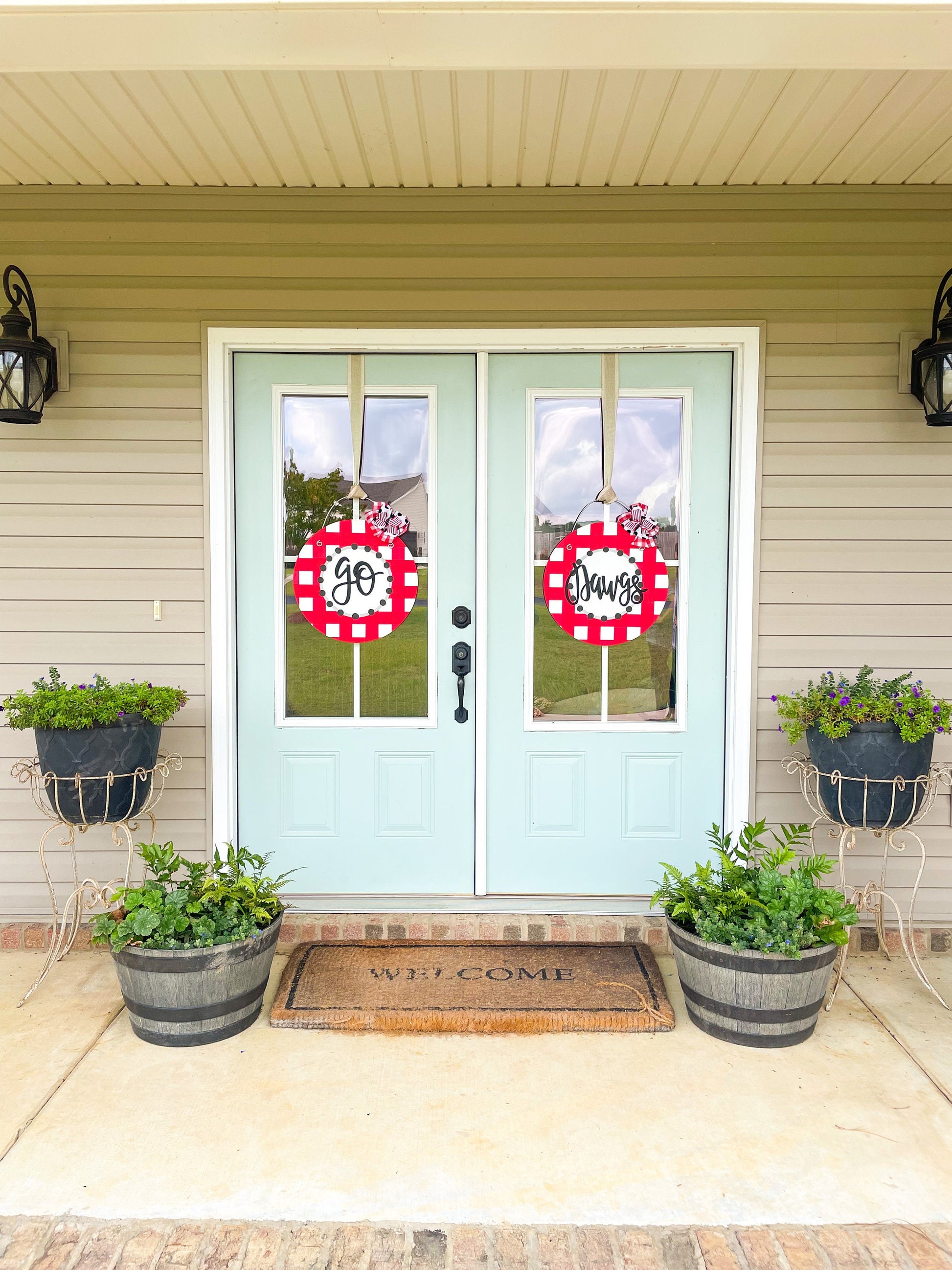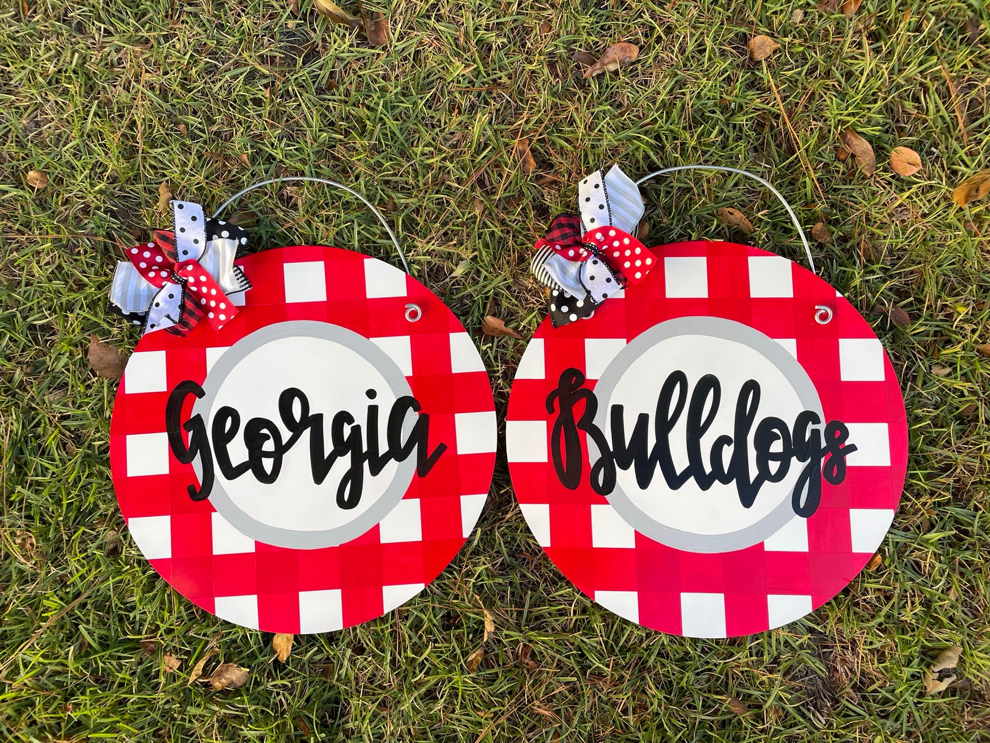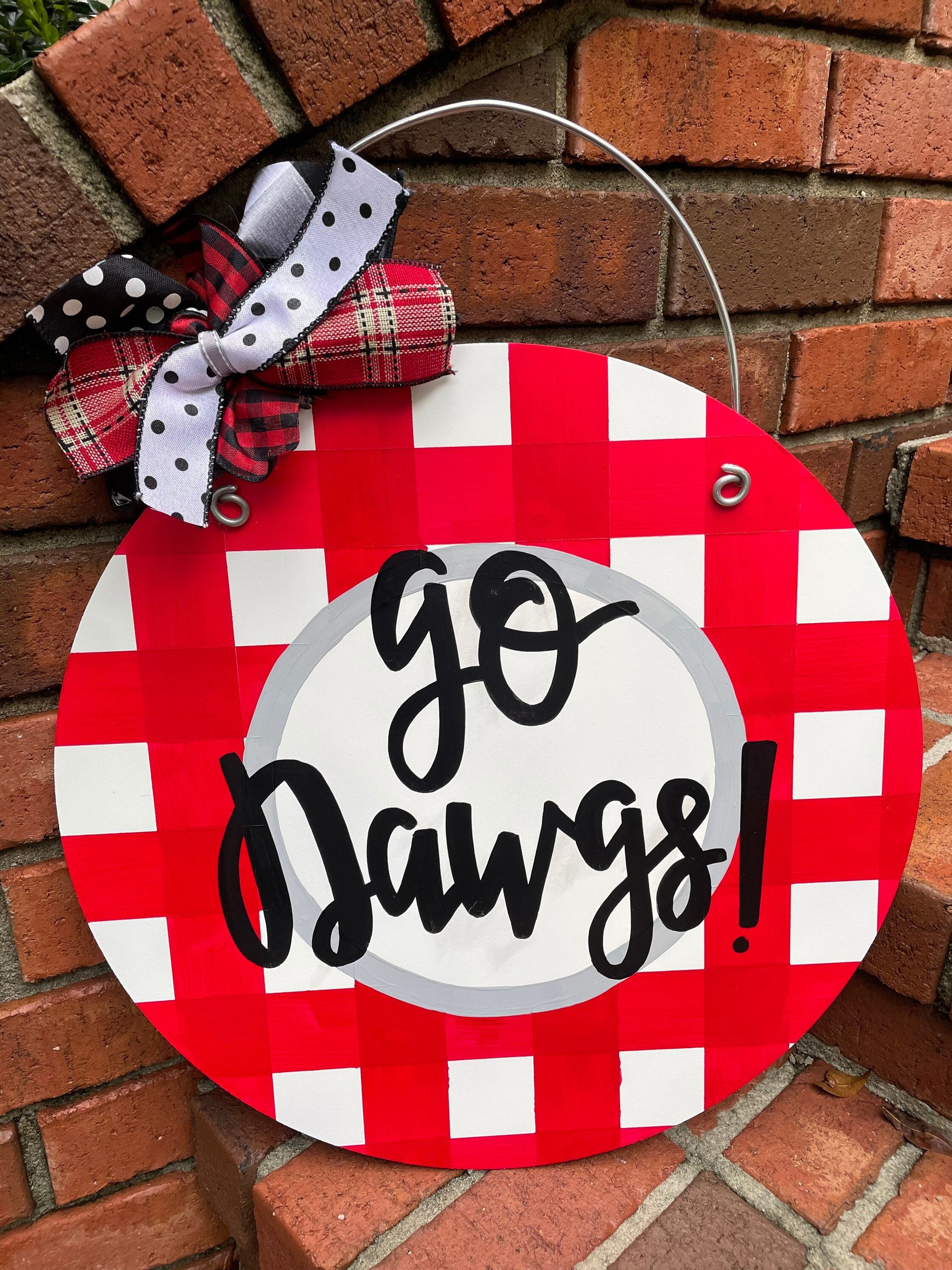 Be game day ready with our gingham wood door hanger! This hanger can be customized to any color you'd like. The circle measures 20" and includes a wire hanger. Include color choice and personalization information in notes to seller. Please note: this listing is just for one door hanger.